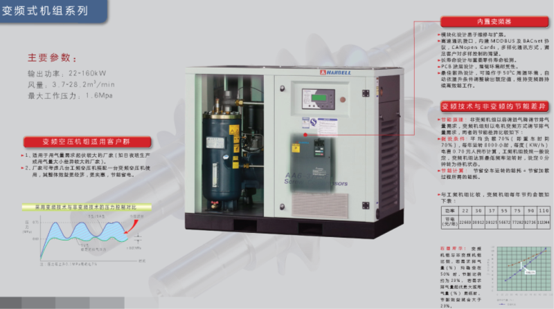 節(jié)能原理:非變頻機(jī)組以容調(diào)進(jìn)氣閥調(diào)節(jié)排氣量需求,變頻機(jī)組則以電機(jī)變頻方式調(diào)節(jié)排氣量需求,兩者的節(jié)能差異如下: