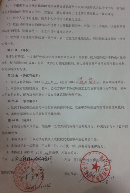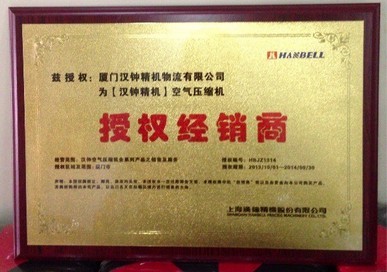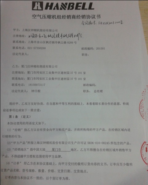 2013年10月份臺(tái)灣漢鐘精機(jī)授權(quán)廈門漢鐘精機(jī)有限公司--總代理經(jīng)銷權(quán)
